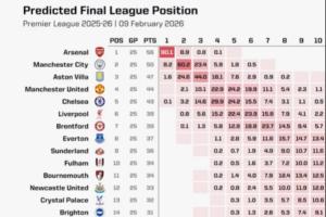 体育资讯02月09日讯 英超第25轮结束,阿森纳6分领跑积分榜,曼城、维拉分列二三。opta也更新了英超夺冠概率,其中阿森纳高达90.1%,曼城8.2%,维拉1.6%,切尔西0.1%,利物浦和曼联则是0%。
