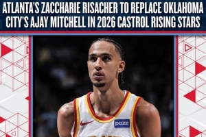 体育资讯2月11日讯 NBA官方宣布,24年状元秀老鹰前锋里萨谢将顶替雷霆后卫阿杰伊·米切尔,加入特麦迪执教的Team T-Mac,出战2026年全明星新秀挑战赛。
