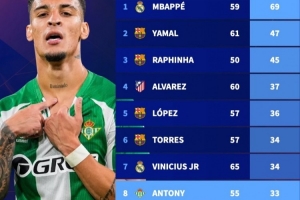在曼联经历低谷之后,安东尼在贝蒂斯重振了自己的职业生涯。本赛季到目前为止,他各项赛事代表贝蒂斯出战29场比赛,打进10球送出9次助攻。