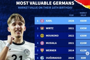 体育资讯2月22日讯 拜仁小将卡尔今日迎来18岁生日,数据统计显示他也是历史同龄德转身价最贵的德国球员。