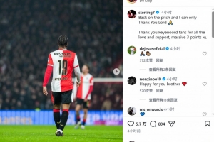 斯特林此役替补出场,上演费耶诺德首秀,赛后他在社交媒体上写道:“重返赛场,对上帝唯有感恩。”