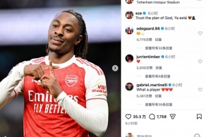 体育资讯2月23日讯 英超第27轮,阿森纳客场4比1大胜热刺,笑傲北伦敦德比。赛后,梅开二度的埃泽更新社媒庆祝胜利。