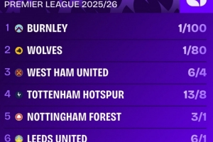 本赛季英超降级赔率排名: