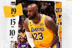 最老三双!湖人官方发布詹姆斯本场数据海报:19+15+10